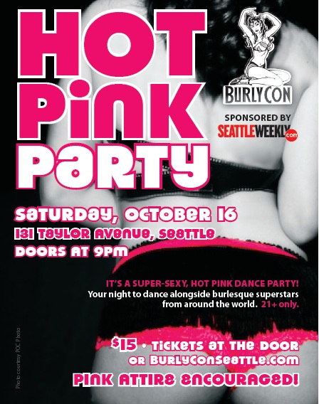 BurlyCon’s workshops, panels, and general burlesque bonding continue today, culminating in a party for attendees and the general public tonight. Seattle’s bellydancing dynamo Fuchsia FoXXX hosts the Hot Pink Party at Cirque Event Center. The only BurlyCon event open to non-attendees, the party is a chance to tear up the dance floor and hobnob with burlesque performers from around the world. The DJ lineup includes Ramiro (Uniting Souls), Nark (Fringe, Lip Service), and Michael Holden (Seattle Erotic Art Festival). Party-goers are encouraged to wear pink or “flirt with someone wearing pink”. It might be the highest concentration of burlesque starlets in one place since Dita Von Teese last came to town. Which means you should go.