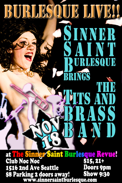 This week in Seattle, Sinner Saint Burlesque indulges their own occasional musical dalliance. Thursday night you can catch the lovely ladies in between “official” runs with the accompaniment of The Tits and Brass Band, a five piece off-shoot of The Yellow Hat Band. It’s always a pleasant surprise to hear a horn section at Noc Noc, and the air is charged with a little extra chemistry when the ladies shake it to live music. Sinner Saint packs them in week after week- hit Noc Noc’s Happy Hour if you arrive before 9pm and claim yourself a ringside seat.