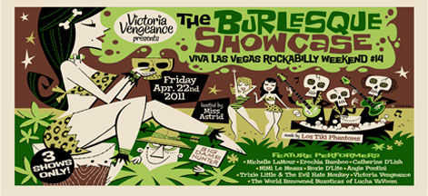 The annual Viva Las Vegas Weekender takes place April 21-24 2011 in Vegas. Though it hinges on a sprawling pre-1963 only car show, the Friday night VLV Burlesque Showcase (produced by Victoria Vengeance) has become a major attraction- this year expanding to three shows featuring Michelle L’amour, Mimi le Meaux, Catherine D’Lish, and the crown jewel of emcees, Miss Astrid (who incidentally, hosts the Gypsy Centennial in Seattle this weekend).