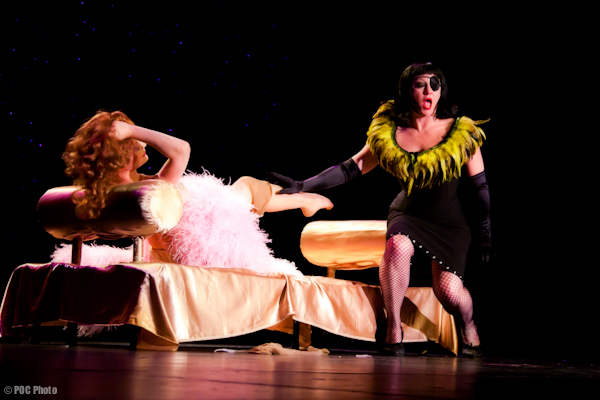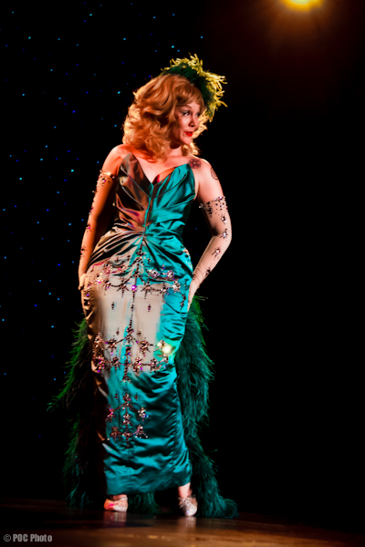 The second act brought a hint of realism: a video segment prepared for the event by Deirdre Timmons (director of A Wink and A Smile) showed Gypsy’s silver screen highs and lows as well as a sardonic quote regarding her terminal cancer (“a present from my mother”). Next up, Miss Astrid introduced Dixie Evans, now 84, to thunderous applause. Dixie was adorable and gracious, grinning from ear to ear and ecstatic to be addressing the crowd. “Burlesque is back and Seattle, you’ve got the world on a string,” she said. “I may be hanging by a thread, but I’m still here!” Dixie talked briefly about the making of the museum, exclaiming “I don’t know how or why, but one by one, they started to come. Thank you to all today’s burlesque performers, you’ve kept me hanging on.” A nearly-nude Lily Verlaine walked through the audience afterwards, followed by a spotlight and taking donations in whatever tiny bits of costume they might fit. With Lily’s benevolent body, it appeared the museum raked in quite a nice stash of donations. Catherine D’Lish- who now hangs her feather boas in the Seattle area- was a powdery, perfumed vision in a ruffled pink gown and matching boa. No one masters smoldering sensuality as Catherine does. Her exquisitely slow reveals while slip-sliding around a golden chaise were eagerly watched over by Miss Astrid, who feigned lustful agony as Catherine allowed her to assist with one stocking. Joan Arline, now 78 and in fabulous shape, took the stage next with an act written by her former husband, “The Seven Approaches of a Man”. Earlier in the day, I had the pleasure to talk with Joan and she confessed that when her ex suggested she have a go at burlesque, Joan wouldn’t speak to him for a week. Afterward she and a friend wore trenchcoats and kerchiefs to visit a local burlesque theatre, flipping a coin to see who would ask for tickets. Fifty-five years in the business later, it might have been the most important ticket Joan ever bought.- J.Price