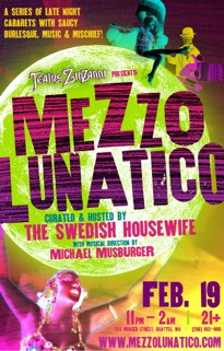 For the last quarter of 2010, Mezzo was curated by the incorrigible El Vez, who hosted Catherine D’Lish, Scotty the Blue Bunny, the Luminous Pariah, and Manuela Horn. At the moment The Swedish Housewife is having her way with Mezzo, and for her second of three productions she is joined by Poppy Daze (founder of the original aerial girl gang The Aerialistas) plus Lily Verlaine, Cherdonna and Lou, and Mark Pickerel.