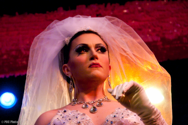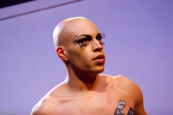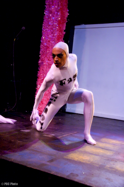 The most daring was a slippery but well-executed feat of cultural reappropriation. The Luminous Pariah, dressed as a Klansman, disrobed to Beats Antique overlaid with an amalgam of speeches from Hitler, Martin Luther King Jr., and anonymous KKK members. Revealing a body suit painted with derogatory terms, Luminous stripped further to a g-string and impossibly long lashes. “As the Luminous Pariah- a brown-skinned, male-bodied, lady-faced queer- I represent people of all races/ethnicities, sexes/genders, and sexual preferences. It was seemed to me only natural to take on the hooded role of hate in action,” he later explained.