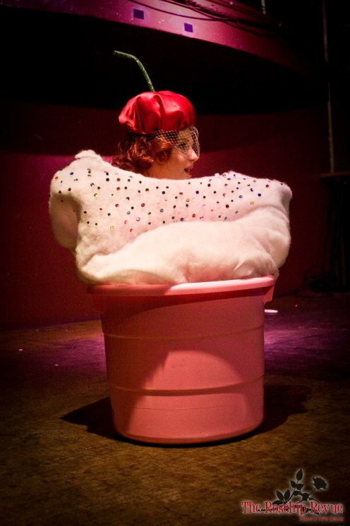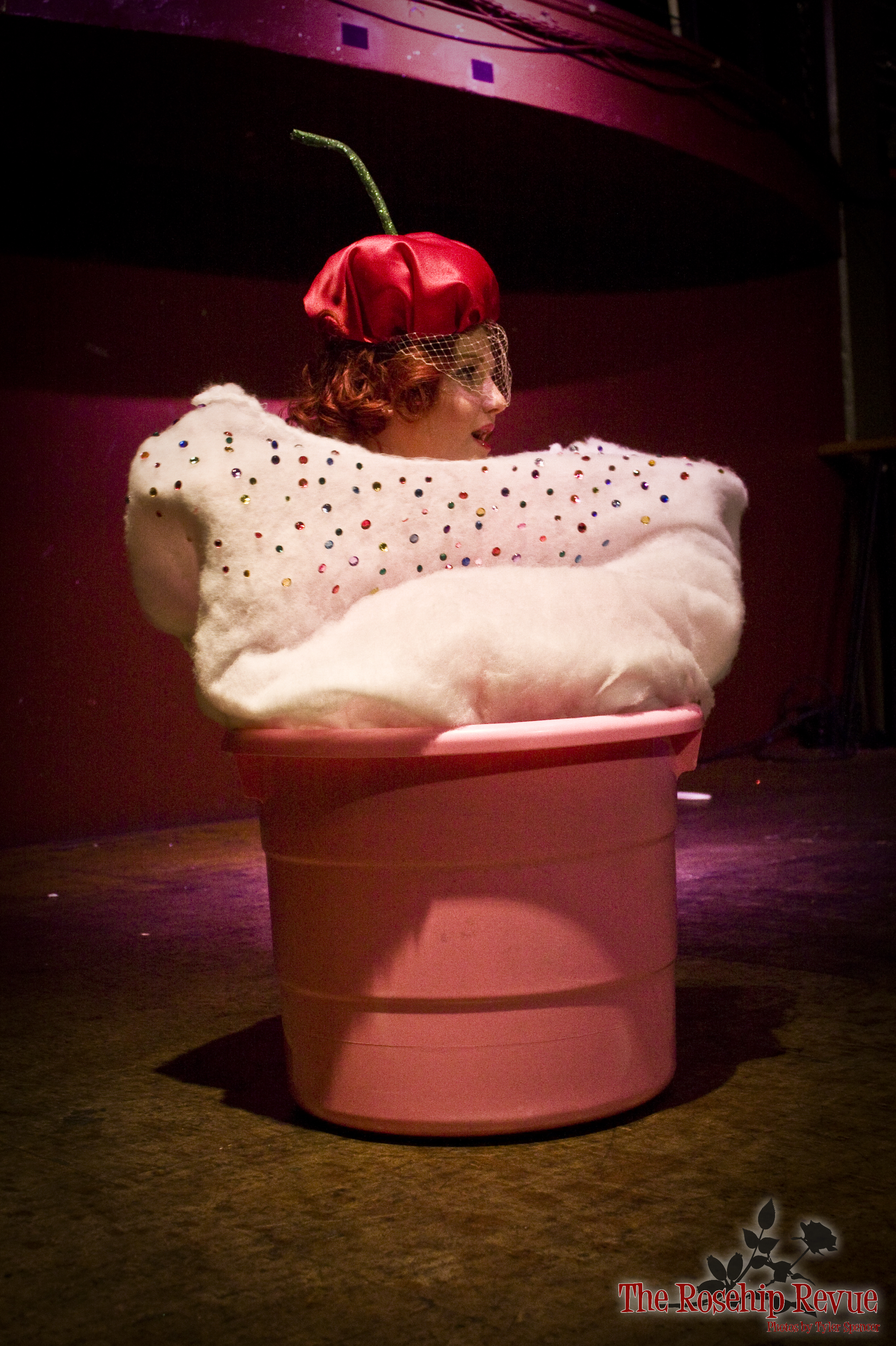 Best known of Cherry’s acts is her “Sugar In My Cha Cha Cha” routine. Two stagehands in chef hats carry out a gigantic cupcake with a large, silky cherry on top. Moments into the song “Cha Cha Cha Du Loup”, the cupcake begins to shimmy, and the felt frosting lifts up to reveal Miss Valance grinning mischievously inside her handmade contraption. Emerging with her cherry hat still firmly affixed to her head, she bumps and grinds until the song changes into an instrumental of “Sugar In My Bowl”, which she belts out with a ferociousness that does Nina Simone all due justice. Cherry says of this act’s creation: “I was cruising the aisle at the fabric store, it suddenly hit me: I shouldn’t just have cupcakes in my set, I should be a cupcake! The instant I thought this, I looked to my right and saw a baby pink Rubbermaid bucket that looked like the bottom of a cupcake. I found a corner behind the yarn section and plopped myself in to see if this would work- what do you know, it was a perfect fit! I blurted a strangely orgasmic ‘YES!’ and fist-pumped to the high heavens, as old ladies peeked through the yarn racks to see what all the fuss was about.” And thus, Cherry Valance’s most beloved act was born- and has since taken to stages throughout Oregon and California.