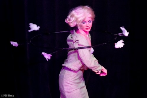 Seattle starlets Minetta Lane and Roxie Moxie of Stripped Screw made their way to the festival and performed as a duo with their fiery Faustian act. I also caught up with one of the Rose City Shimmy gals from Portland, Baby Le’Strange, whose hot dog number electrified the crowd. One of my favorite acts of the weekend was Lula Hoop Guru and her tribute to Hitchcock’s “The Birds”, which won the Best Novelty/Vaudeville prize. I’ve seen burlesque hula hooping before but Lula was quite ingenious in her interpretation of the classic ’60’s movie. I was also glad to see some boylesque at TBF with newcomers Foxxy Blue Orchid and Stephan wooing the crowd nicely. It seems that boylesque is becoming more prominent at festivals across the country. Looking forward to next year’s Texas Burlesque Festival already!