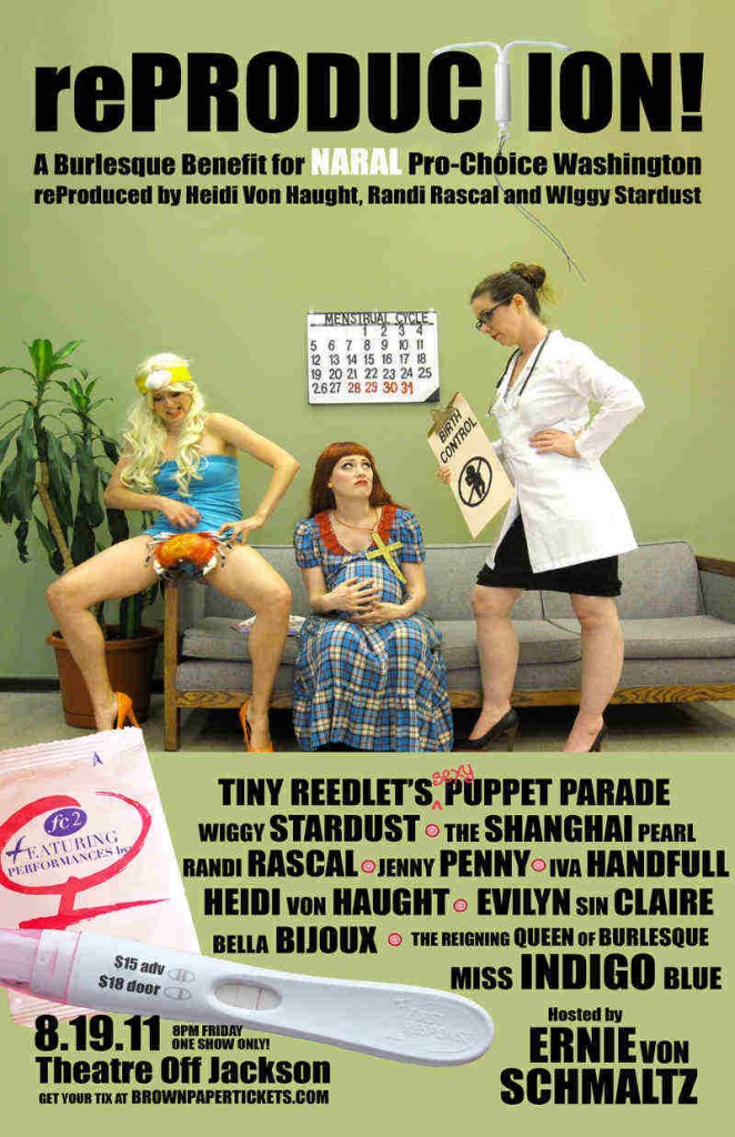 reProduction: A Burlesque Benefit for NARAL Pro-Choice Washington features Bella Bijoux, Evilyn Sin Claire, Heidi Von Haught, Iva Handfull, Jenny Penny, Randi Rascal, The Shanghai Pearl, Sylvester Stiffbreeze, Tiny Reedlet’s Sexy Puppet Parade, Wiggy Stardust, and Reigning Queen of Burlesque 2011, Miss Indigo Blue. Hosted by lover of ladybits everywhere, Ernie Von Schmaltz. Show is at 8:00pm on August 19th at Theatre Off Jackson. Purchase your tickets now at www.brownpapertickets.com/event/190010.