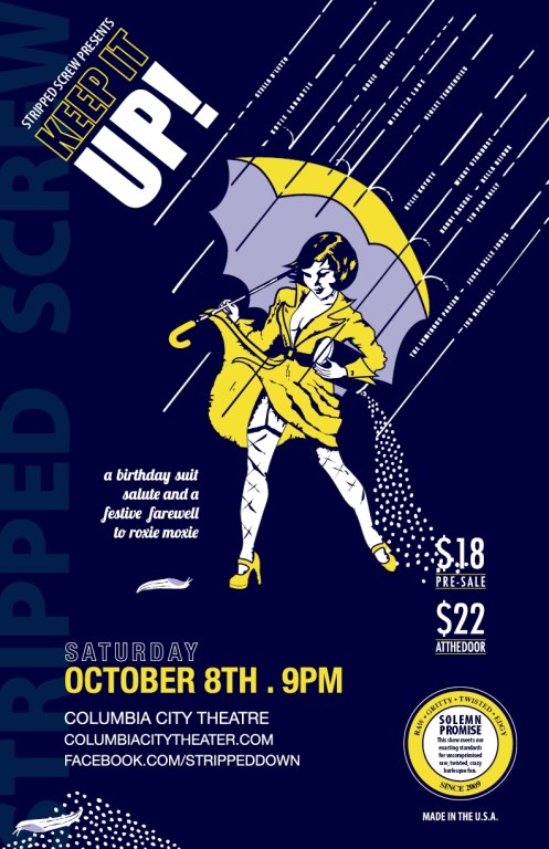 But it all began with Stripped Screw. And now one of their own- Roxie Moxie- is about to relocate back to Austin, leaving the nest but definitely not leaving burlesque. Her last show with Stripped Screw- Keep It Up– is October 8 and will double as farewell show/birthday show for the troupe.
