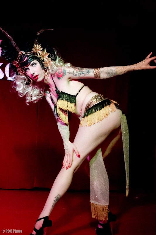 Last month’s visit from Portland burlesque collective Rose City Shimmy was memorable not only for the finely tuned bumps and grinds, but for a particularly raucous audience response. Men were hollering, ladies were shrieking- it could have been flesh-pinching pandemonium had the ladies not been such consummate teasers. Host(ess) Diva le Déviant (freely referring to herself as “The Bitch In Charge”) kept the crowd and its sprinkling of birthdays and bridesmaids on task with foul-mouthed sass, not unlike a brassy Bette Midler.