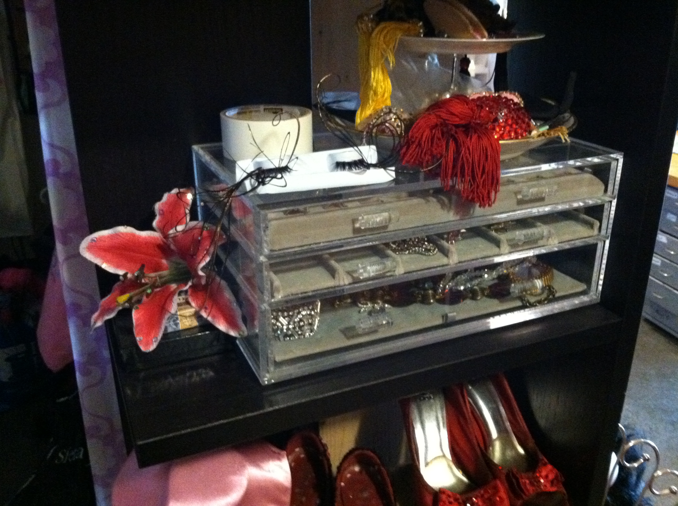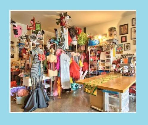 Wandering into The Shanghai Pearl’s downtown workspace/loft apartment is a bit like stepping into an exotic den of fanciful things, a glamorous costume museum-cum-workspace. In fact, it’s exactly like that- every surface, shelf, and ceiling-high hanger as you cross the threshold’s stone floors is festooned with beautiful objects either fully formed or in process. The indelible impression is that the visitor is a fortunate guest where showgirl fineries rest in their “off” time. Impossibly long, curlicued eyelashes made of feathery tendrils wink demurely from a perch. Multicolored pasties twinkle in a tiered dish, their tassels curled demurely around tiny Swarovski points. Bejeweled heels and taffeta skirts peek from cabinets and hangers. A dress form proudly displays an elaborate “barely there” gown of what appears to be nothing but beading and tiny strips of black trim. (Shanghai tells me later it’s actually made of beads, twill, satin, glue, and “showgirl math”). The room is a wonderland of detail one could easily get lost in, but there’s a definite air of organization and neatness to The Shanghai’s Pearl’s loft. You get the impression if one single rhinestone was misplaced, a preternatural instinct would kick in and she would know it.