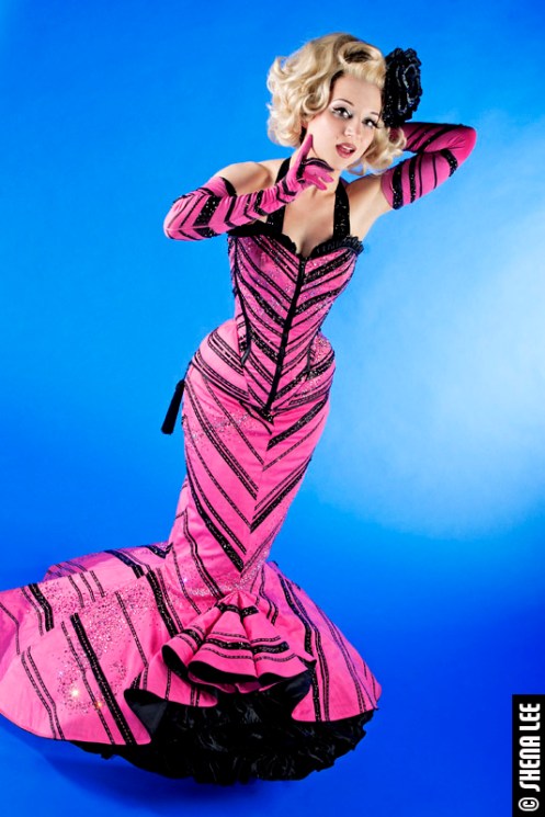 Inga Ingenue in a gown by Danial Webster (Photo by Shena Lee); Please visit Inga at http://www.bluevelvetburlesque.com)