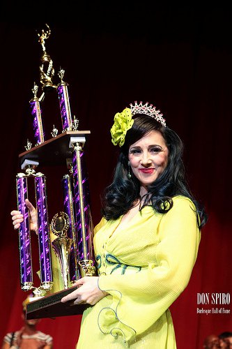 Not to mention the Reigning Queen. No performer, teacher, or ecdysiast entrepreneur is more revered than our very own Twirly Girl, Miss Indigo Blue- who was crowned “Reigning Queen of Burlesque 2011″. Indigo took home a tiara and a three-foot tall trophy for her win, and was awarded a second trophy for “Most Classic”. In the words of Jo Weldon just after Indigo’s title was announced: “When Indigo wins, everybody wins.”