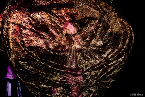 What I wanted to do in the final piece of music (“Crown on The Ground”) was create a really visually exciting piece but also one in which I symbolically and actually take the crown off of my head and place it on the ground to figuratively and literally hand it over to the next queen. Then the final piece where I rose into the ceiling, it was really interesting because since I was a small child I’ve been drawing pictures of a woman with her arms back and her legs out and a big, red explosion coming out of her chest, like an explosion of love and power and passion just pouring out of her chest. A couple of years ago I was doing a dance intensive in Brazil and had a really strong vision of that image come back into my mind. And I wanted to do a real dance piece, a legitimate dance piece in which I invoke that image and I had that imagery. I was real excited that in this piece by rising up into the air with red wires bringing me up to the ceiling I was able to invoke that image and be that love and that power.