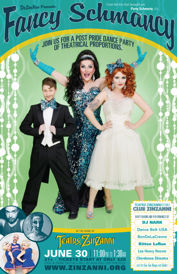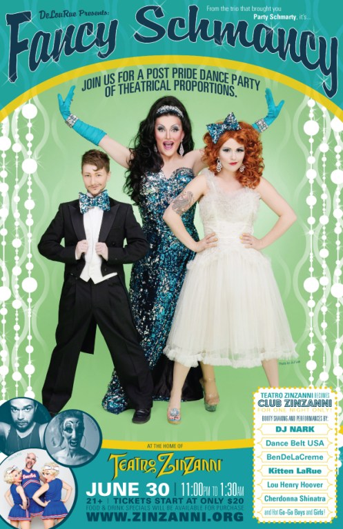 From the crew that brought you PARTY SCHMARTY it’s….FANCY SCHMANCY! Suffering from pride withdrawal? Well dust off your most debaucherous dancin’ duds and get ready to sweat out those post-pride blues cuz it’s ALWAYS gay when DeLouRue gets their glittery mitts on it! It’s the wildest party ever to invade an antique Belgian spiegeltent! Drink it, snack it, twerk it, and feast your peepers on acts by some of Seattle’s most over-the-top performers! And remember: The Swanky Skankster always dresses for excesses. Teatro ZinZanni becomes CLUB ZINZANNI for one night only!