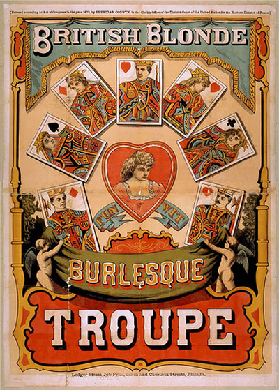 What I mean is that burlesque is and always was a kind of fan culture. Classical burlesque, the burlesque genre Lydia Thompson and her British Blondes brought to the United States in 1869, was a style of performance in which women in drag performed parodies of classical dramas. These scripts poked fun at contemporary culture from within their ancient narrative contexts by including political satire, cultural references to other popular entertainments of the time, and so on. The racy part of these performances was the costuming: burlesque actresses performing male roles wore breeches that showed the curves of their calves and ankles through silk socks. The appearance of feminine calves in a masculine role was yet another way performers poked fun at contemporary culture: by asserting a visual gag about gender into the genre of the performance itself. The texts they performed drew extensively on mainstream popular culture in the late 19th century, appropriated it, poked fun at it, and, in so doing, extended the text’s life and meaning in a way that enabled burlesque performers (and writers) to articulate something about the culture in which they were performing.