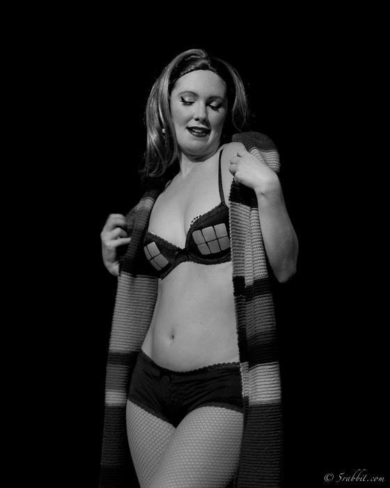 This method of appropriating, rescripting, and extending texts is what media studies scholar Henry Jenkins refers to as “textual poaching.” For Jenkins, poaching is the very heart of fan culture. Fandom, and particularly fan fiction, filk songs, or other kinds of fan-art that is sourced and created by fan communities, is about arresting control of the dominant text from its creator to rework it for one’s own purposes. So if Mulder and Scully don’t hook up onscreen, they can hook up in fan fiction (or, if you prefer, Mulder can hook up with Krychek). When fans create content that extends the fannish universes of their choosing, fans then have control over the creation of the dominant narrative. Likewise, a burlesque number such as Scarlett O’Hairdye’s “Romana” act (in which she considers what Romana would do with the 4th Doctor’s scarf if she were alone with it in a Tardis) appropriates the Whoniverse and extends the narrative in the manner of the performer’s imagining. Nerdlesque can also appropriate and resignify the meaning of the texts they poach, as I do in my “Trouble with Tribbles” number. Those problematically multiplying, purring little balls of fur from the classic Star Trek episode become my pasties and merkin. It’s a parodic appropriation and resignification of a dominant cultural text which turns a sci-fi icon into a comment on body hair.