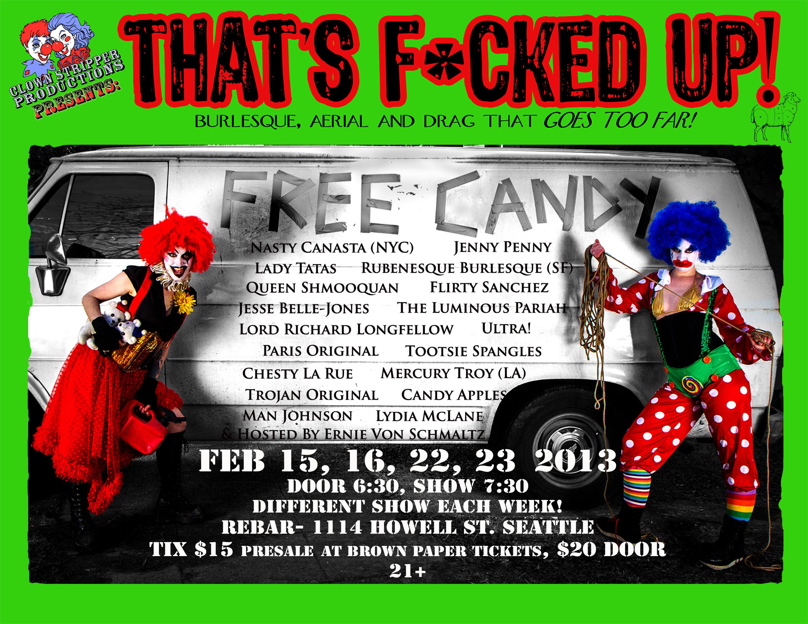No one would have guessed a bizarre little show with an expletive for a name would become an annual staple for artists nudging burlesque a little farther from plucky bra strap popping into full-fledged performance art. The That’s F*cked Up! series, now in its fourth incarnation, has done exactly that. Every year the theme has widened, the call for proposals often bringing in acts dealing with serious subject matter such as domestic violence and rape. Which isn’t to say there’s not a good dose of the lighthearted and dirty in there as well, you just have to clench your teeth through a few uncomfortable moments before that kind of release.