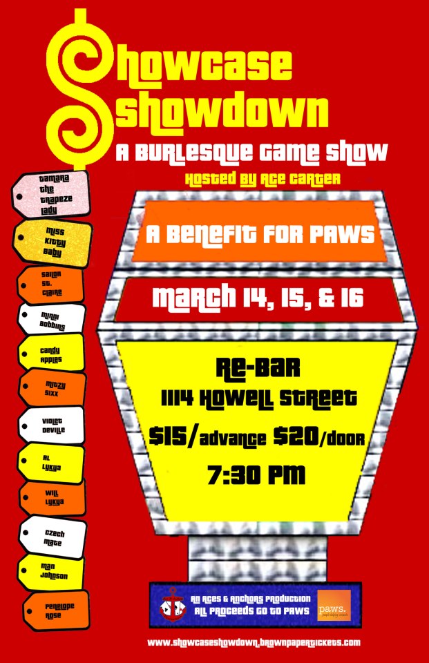 Showcase Showdown: A Burlesque Game Show to Benefit PAWS @ Re-Bar March 14-16 7:30 pm