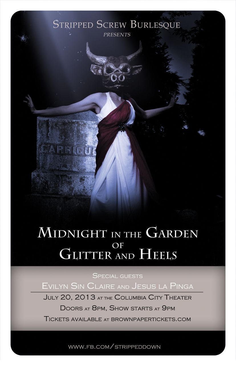Temperatures are rising, and with it Stripped Screw Burlesque’s propensity for lunacy and wild fits of lascivious behavior. Their savage new production, Midnight in the Garden of Glitter and Heels, was actually the original working title for the Screws’ successful Undressed to Kill show. When the material took the troupe in a different direction Midnight in the Garden of Glitter and Heels was scrapped as a title. Founding member Violet Tendencies – never one to shy away from her darker impulses – couldn’t quite set aside the more insidious themes the sidelined title and concept brought to mind.