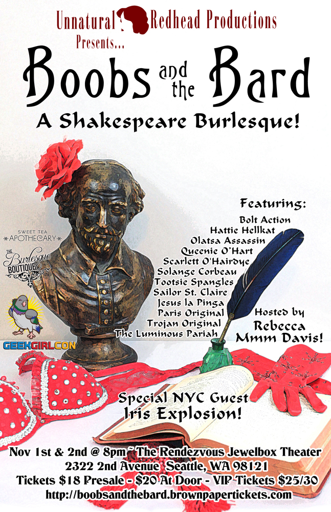 Scarlett O’Hairdye of Unnatural Redhead Productions brings us a new themed burlesque show this Friday and Saturday (November 1-2) at The Jewelbox Theater at The Rendezvous: Boobs and the Bard – A Shakespeare Burlesque!