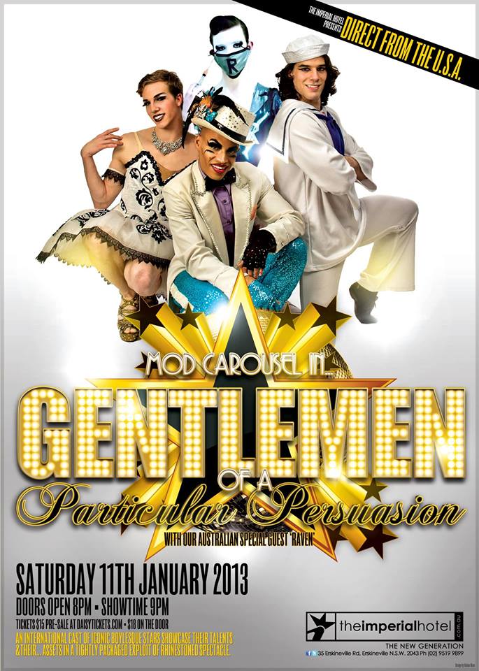 First off, Seattle’s beloved multi-disciplinary boylesque collective Mod Carousel are off to Sydney, Australia. Paris Original, Trojan Original, and the’Luminous Pariah will be joined by Raven (“Mr. Boylesque Australia 2012”) in Gentlemen of a Particular Persuasion. The show is January 11, and though it’s unlikely most of us can make the trip, we’re incredibly proud of them and can’t wait to hear about their adventures.