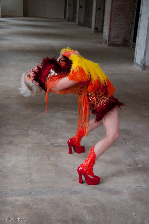 The first of three brisk acts leaned heavily on exotics and belly dance, not so much on the espionage of the show’s namesake. Keeping with primarily belly dance felt a little restrictive at first, considering that the Spies’ strength is their range within a framework- combining heavy dance music with intensely physical routines stylistically all over the map. The girls can do the cancan or the caterpillar without missing a beat. You won’t find mock-surprise burlesque faces at a Heavenly Spies show, it’s genuine showgirl smiles at all times. They look like they’re having a ball, and they’re funny: Kimberly Galore jump-roped in a scarf she’d been wrapped in seconds before, beaming her 1000-watt smile throughout Stereo Total’s ridiculous track “I Am Naked”.